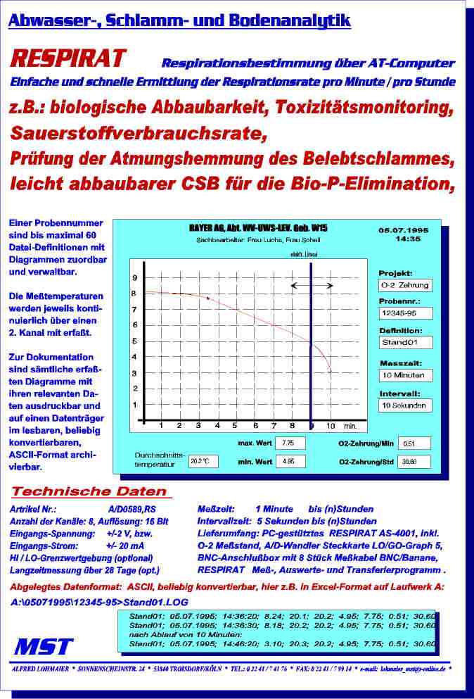 RESPIRAT, MessStation zur schnellen Ermittlung der Respitationsrate pro Minute / pro Stunde. Applikationen: Biologische Abbaubarkeit, Toxizitätsmonitoring, Sauerstoffverbrauchsrate, Prüfung der Atmungshemmung des Belebtschlammes, leicht abbaubarer CSB für die Bio-P-Elimination.